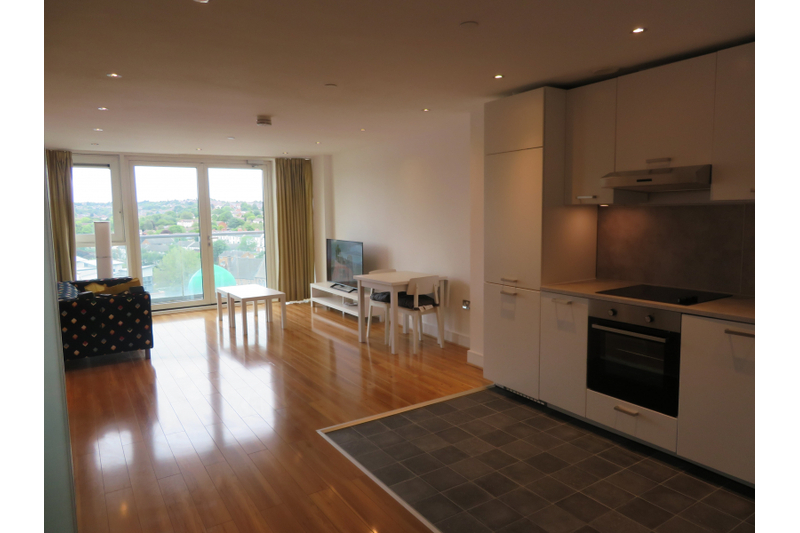 New open-plan living/dining/kitchen area with balcony offering stunning city views